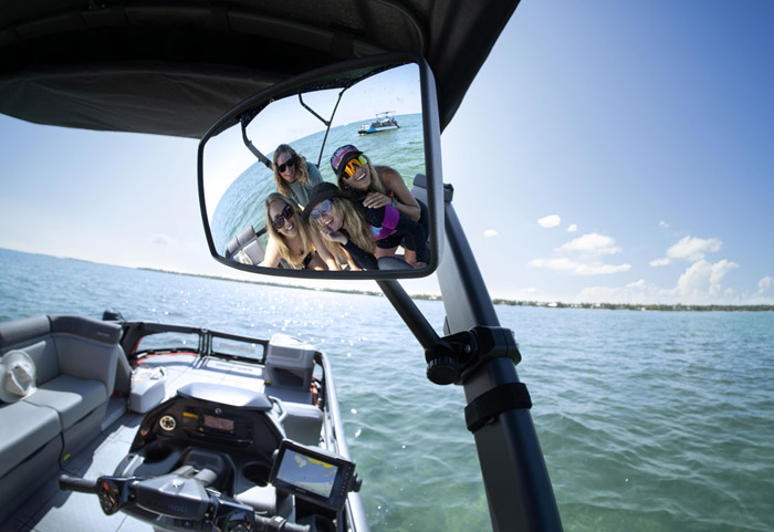 O modelo Sport apresenta detalhes esportivos especiais, como capacidade para até 8 pessoas, amplo deck para descanso com encostos e protetores contra sol, suporte inflável de engate rápido, espelhos retrovisores para acompanhar as manobras de wake, GPS touchscreen Garmin de 7 pol. e muito, muito mais.
